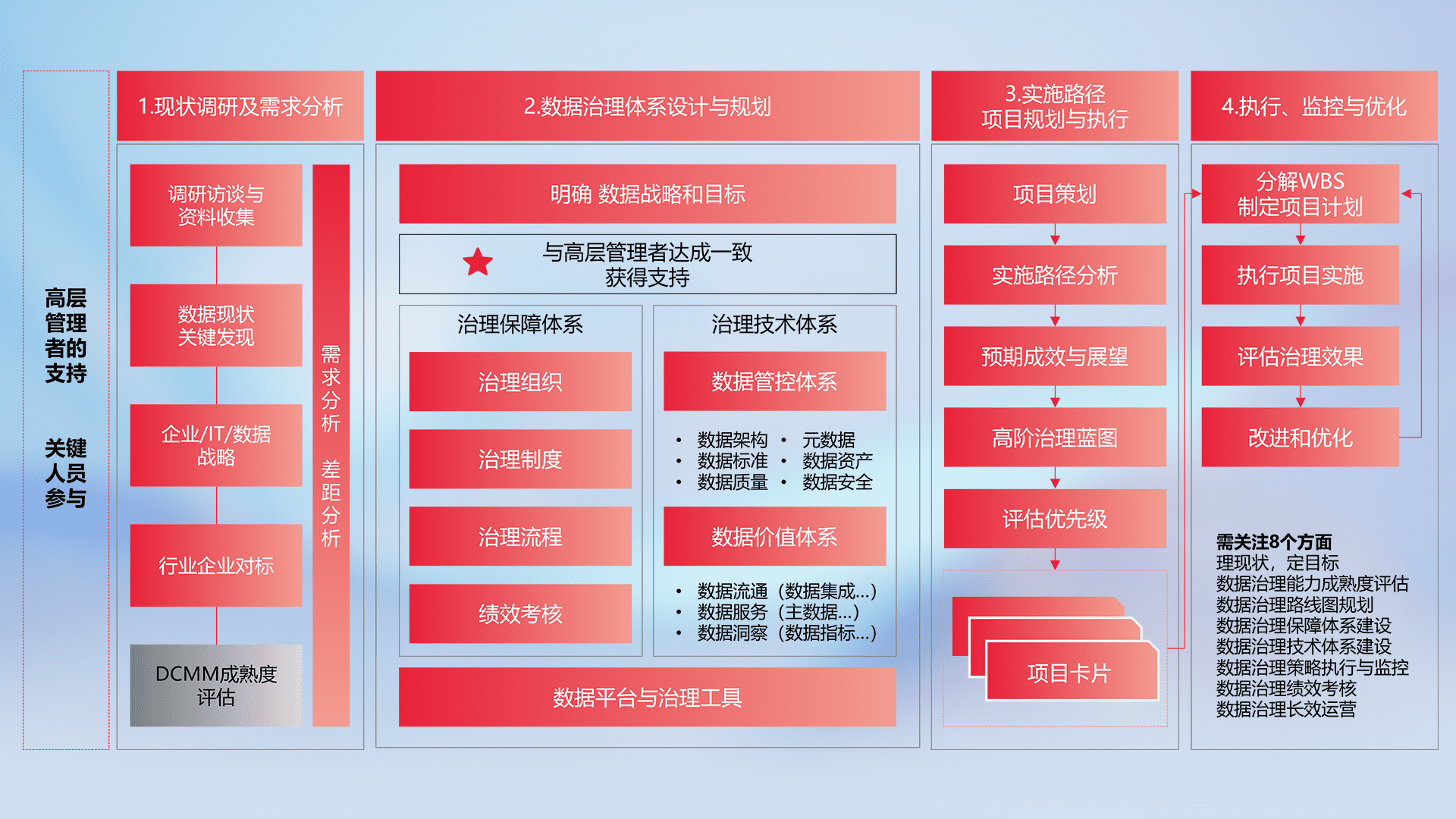 制定并执行统一的数据标准,,,规范数据定义和格式,,,,消除冗余和不一致性,,实现跨部门和跨系统的数据一致性,,为企业提供标准化的数据基础。。